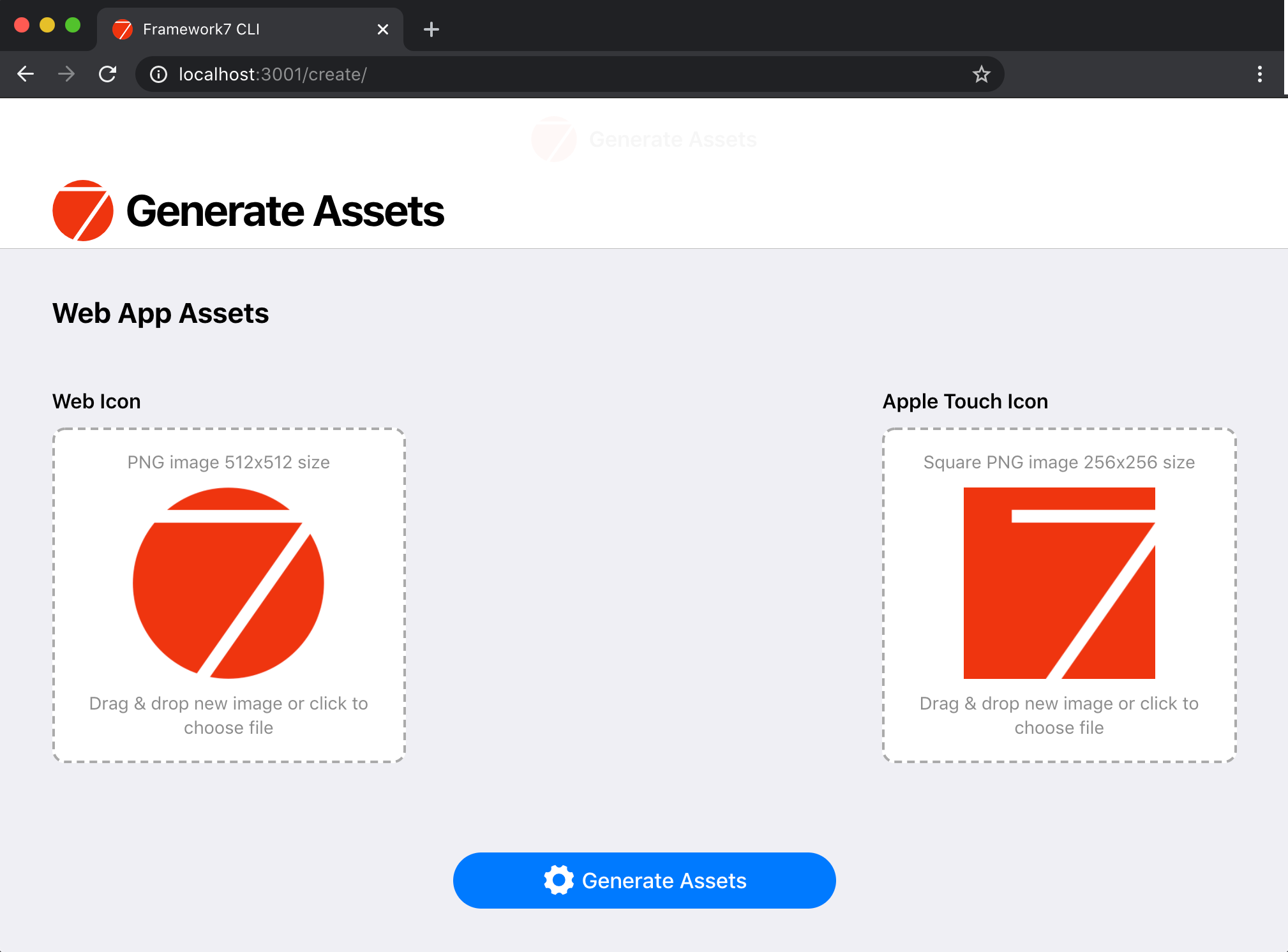 Framework7 CLI allows to launch assets generation process with the user interface.